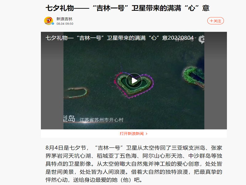 ● 新浪吉林-七夕礼物——“吉林一号”卫星带来的满满“心”意 8月4日是七夕节,“吉林一号”卫星从太空传回了三亚 蜈支洲岛、张家界茅岩河天坑心湖、稻城亚丁五色海、阿尔山心形天池、中沙群岛等独具特点的卫星影像。从太空俯瞰大自然鬼斧神工般的爱心创意,处处皆是世间美景,处处皆为人间浪漫。借着大自然的独特浪漫,把最真挚的怦然心动,送给身边最爱的她(他)吧。 2022-08-04