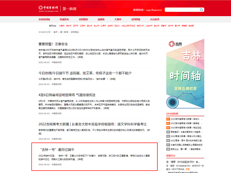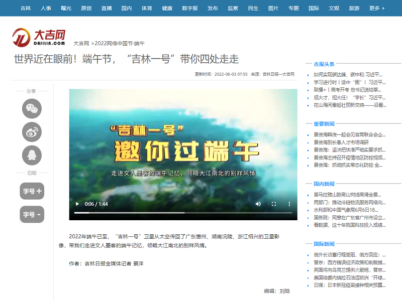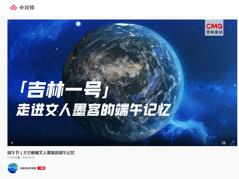 ● 中国吉林网—“吉林一号”邀你过端午 2022年端午已至,“吉林一号”卫星从太空传回了广东惠州、湖南沅陵、浙江绍兴的卫星影像,带我们走进文人墨客的端午记忆,领略大江南北的别样风情。 2022-06-03