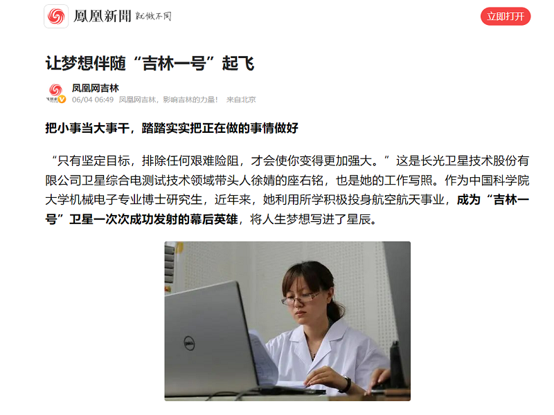 ● 凤凰网—让梦想伴随“吉林一号”起飞 “只有坚定目标,排除任何艰难险阻,才会使你变得更加强大。”这是长光卫星技术股份有限公司卫星综合电测试技术领域带头人徐婧的座右铭,也是她的工作写照。 2022-06-04