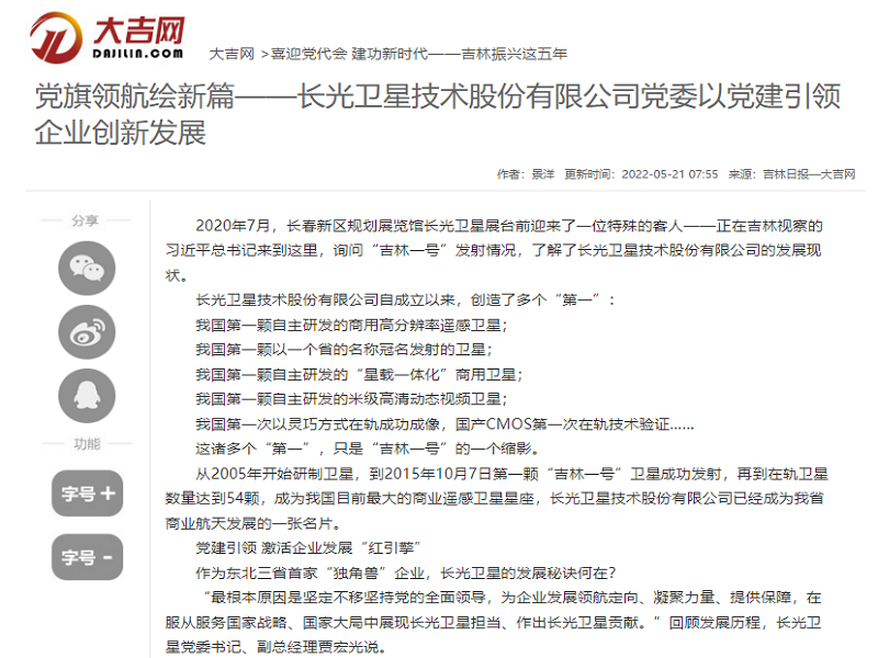 ● 大吉网—党旗领航绘新篇——长光卫星技术股份有限公司党委以党建引领企业创新发展 2020年7月,长春新区规划展览馆长光卫星展台前迎来了一位特殊的客人——正在吉林视察的习近平总书记来到这里,询问“吉林一号”发射情况,了解了长光卫星技术股份有限公司的发展现状。 2022-05-21