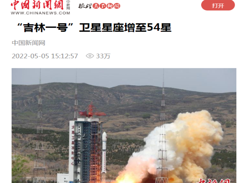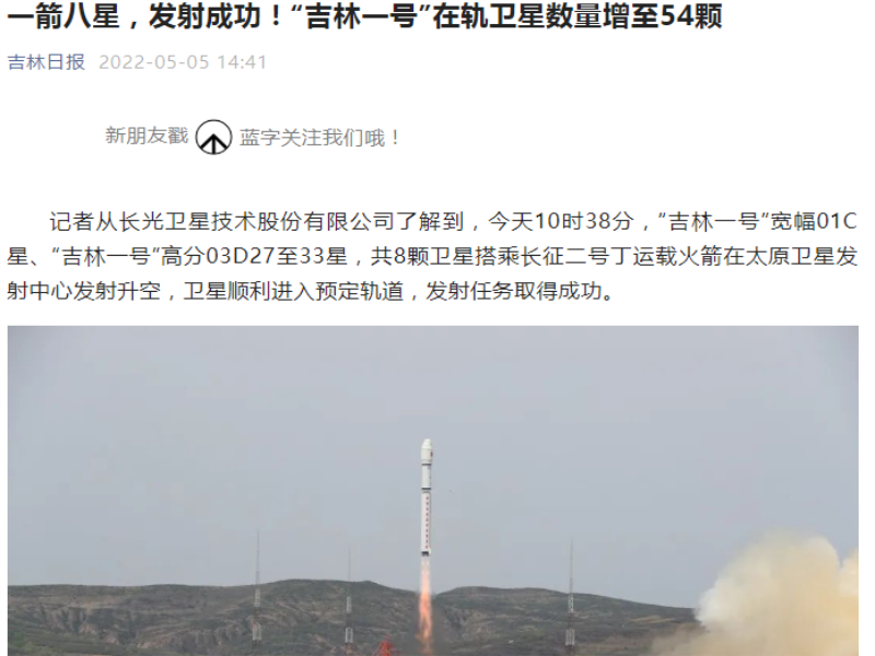 ● 吉林日报-一箭八星,发射成功!“吉林一号”在轨卫星数量增至54颗 记者从长光卫星技术股份有限公司了解到,今天10时38分,“吉林一号”宽幅01C星、“吉林一号”高分03D27至33星,共8颗卫星搭乘长征二号丁运载火箭在太原卫星发射中心发射升空,卫星顺利进入预定轨道,发射任务取得成功。 2022-05-05