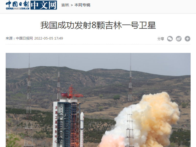 ● 中国日报-我国成功发射8颗吉林一号卫星 北京时间2022年5月5日10时38分,我国在太原卫星发射中心用长征二号丁运载火箭成功将“吉林一号”宽幅01C星、“吉林一号”高分03D27~33星(共包含8颗卫星)发射升空,卫星顺利进入预定轨道,发射任务取得圆满成功。 2022-05-05