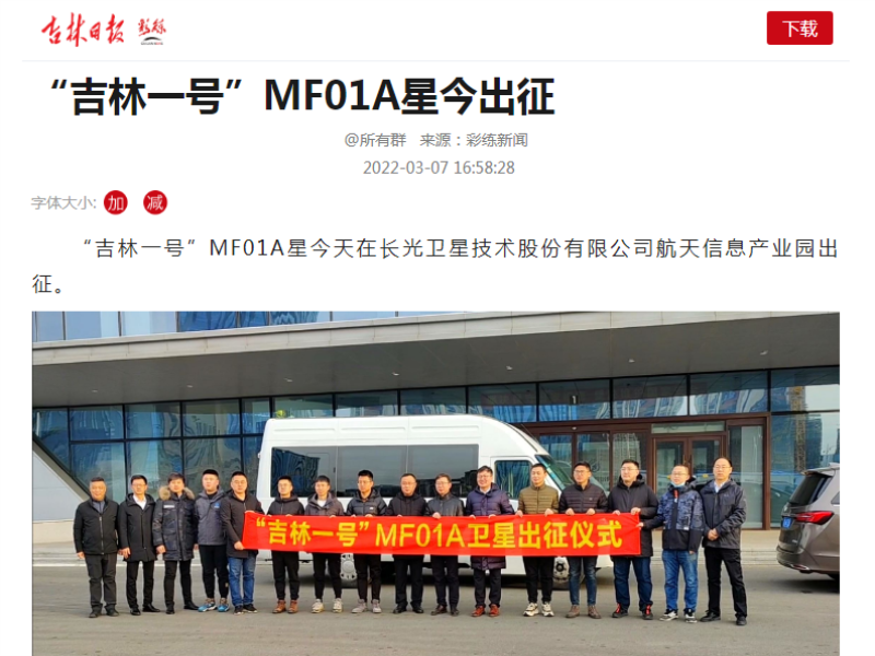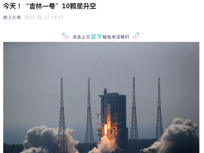 ● 吉视通-第1报道|我国成功发射十颗“吉林一号”卫星 摘要:北京时间2022年2月27日11时06分,我国在中国文昌航天发射场成功发射十颗“吉林一号”卫星,此次任务是“吉林一号”卫星工程的第17次发射。 2022-02-28