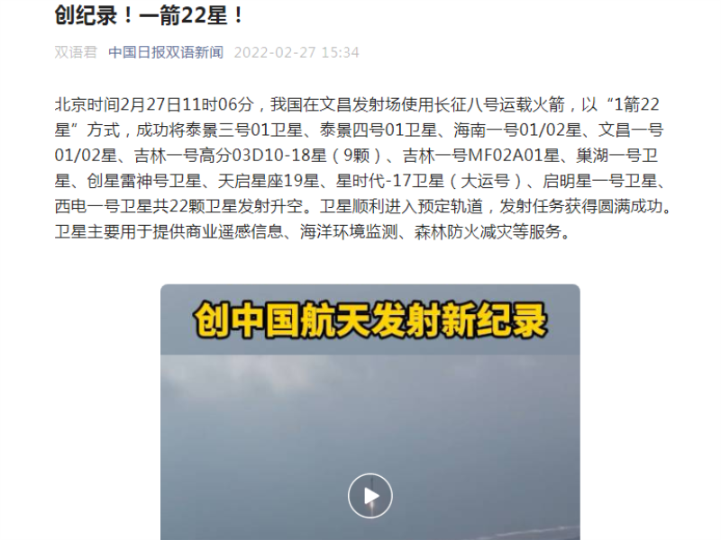 ● 中国日报双语新闻-创纪录!一箭22星! 北京时间2月27日11时06分,我国在文昌发射场使用长征八号运载火箭,以“1箭22星”方式,成功将泰景三号01卫星、泰景四号01卫星、海南一号01/02星、文昌一号01/02星、吉林一号高分03D10-18星(9颗)、吉林一号MF02A01星、巢湖一号卫星、创星雷神号卫星、天启星座19星、星时代-1... 2022-02-27
