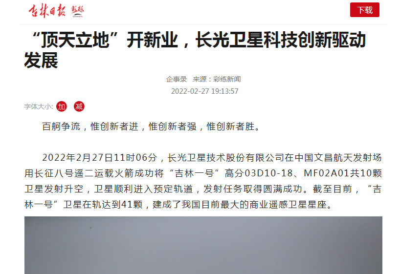 ● 吉林日报-“顶天立地”开新业,长光卫星科技创新驱动发展 2022年2月27日11时06分,长光卫星技术股份有限公司在中国文昌航天发射场用长征八号遥二运载火箭成功将“吉林一号”高分03D10-18、MF02A01共10颗卫星发射升空,卫星顺利进入预定轨道,发射任务取得圆满成功。截至目前,“吉林一号”卫星在轨达到41颗,建成了我国目前最大的商业遥感卫星星座。 2022-02-27