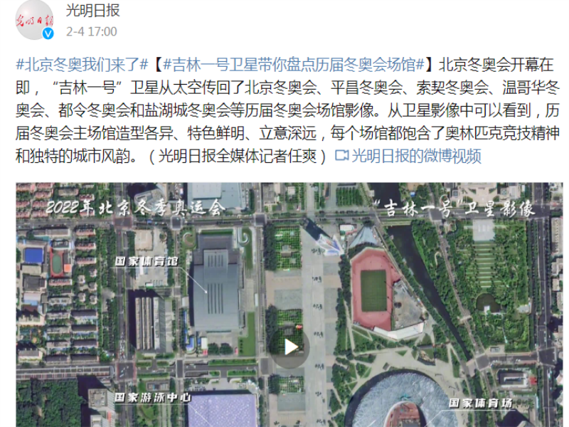 ● 光明日报-吉林一号卫星带你盘点历届冬奥会场馆 北京冬奥会开幕在即,“吉林一号”卫星从太空传回了北京冬奥会、平昌冬奥会、索契冬奥会、温哥华冬奥会、都令冬奥会和盐湖城冬奥会等历届冬奥会场馆影像。从卫星影像中可以看到,历届冬奥会主场馆造型各异、特色鲜明、立意深远,每个场馆都饱含了奥林匹克竞技精神和独特的城市风韵。 2022-02-04