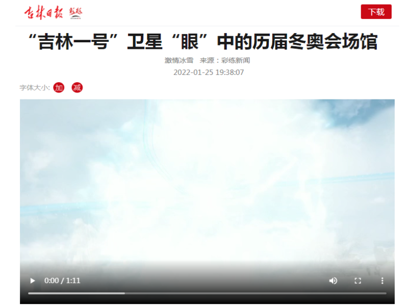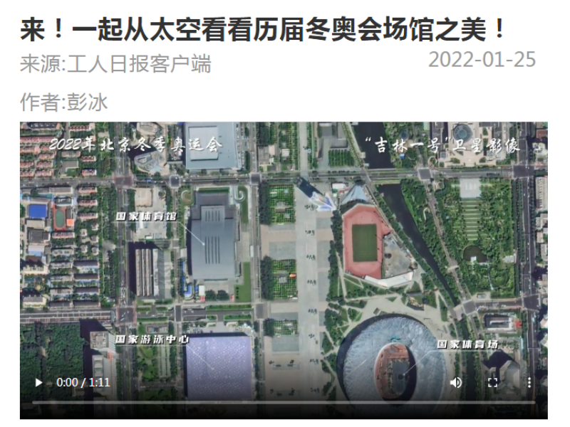 ● 吉林日报-“吉林一号”卫星“眼”中的历届冬奥会场馆 2022年北京冬季奥运会将于2月4日在北京举行,在此之际,“吉林一号”卫星从太空传回了北京冬奥会、平昌冬奥会、索契冬奥会、温哥华冬奥会、都灵冬奥会和盐湖城冬奥会等历届冬奥会场馆影像。 2022-01-25