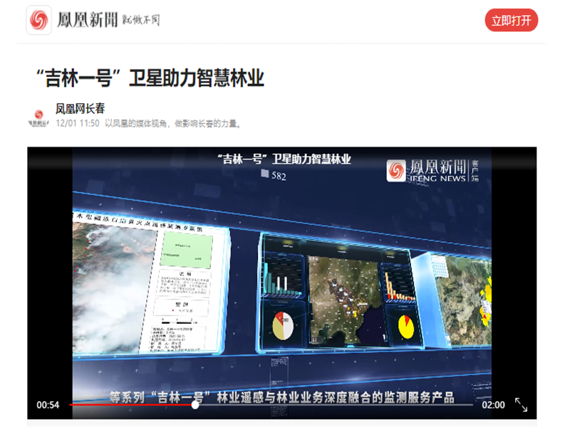 ● 凤凰网-“吉林一号”卫星助力智慧林业 林业资源是我国最宝贵的自然资源之一。随着科学技术的发展,卫星遥感技术在林业应用的广度和深度逐渐扩大,为我国林业资源的保护与管理提供了有力保障。长光卫星技术有限公司依托“吉林一号”卫星星座全天时、全天候、全谱段数据获取能力,充分利用卫星遥感、大数据、人工智能技术以及天空地一体化手段,开发林业资源分布与... 2021-12-01