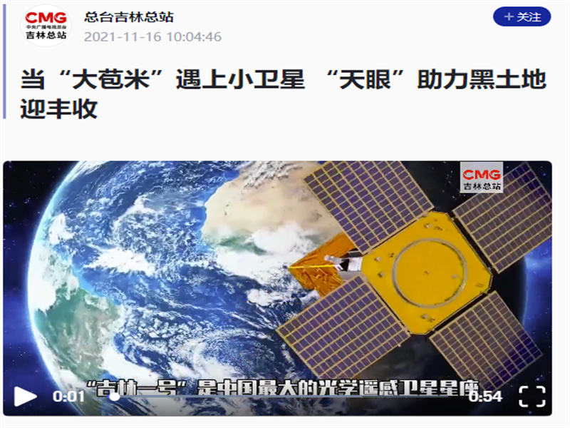 ● 央视新闻-当“大苞米”遇上小卫星 “天眼”助力黑土地迎丰收 吉林秋收工作已近尾声,全省各地迎来大丰收。现代农业设施建设为吉林农业发展提供了重要保障,尤其是卫星技术运用为农业高质量发展提供了科技支撑。 2021-11-16