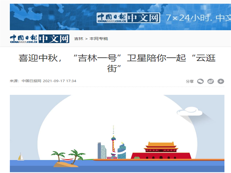 ● 中国日报-喜迎中秋,“吉林一号”卫星陪你一起“云逛街” 2021年中秋佳节将至,“吉林一号”卫星从太空传回了北京王府井、上海南京路、武汉江汉路、南京新街口、重庆解放碑、成都春熙路、长沙黄兴南路、香港铜锣湾等国内著名商业街的卫星影像。从太空俯瞰而下,高楼林立的商业区,繁华热闹的步行街,穿梭往来的车辆等清晰可见。中秋佳节,带上家人跟随“吉林一号”卫星来一场别... 2021-09-17