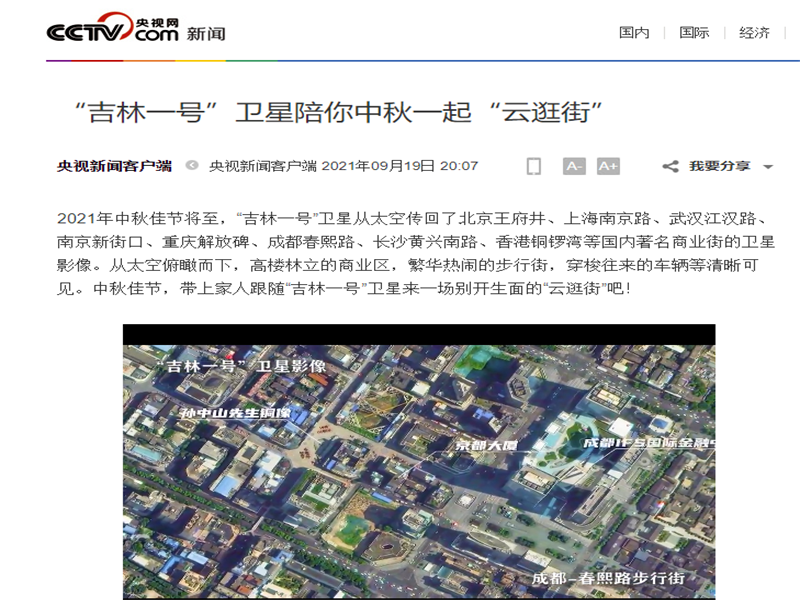 ● 央视新闻-“吉林一号”卫星陪你中秋一起“云逛街” 2021年中秋佳节将至,“吉林一号”卫星从太空传回了北京王府井、上海南京路、武汉江汉路、南京新街口、重庆解放碑、成都春熙路、长沙黄兴南路、香港铜锣湾等国内著名商业街的卫星影像。从太空俯瞰而下,高楼林立的商业区,繁华热闹的步行街,穿梭往来的车辆等清晰可见。中秋佳节,带上家人跟随“吉林一号”卫星来一场别... 2021-09-19