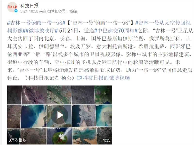 ● 科技日报-“吉林一号”俯瞰“一带一路” 5月21日,适逢#中巴建交70周年#之际,“吉林一号”卫星从太空传回了国内北京、长春、上海,国外巴基斯坦伊斯兰堡、俄罗斯莫斯科、土耳其安卡拉、伊朗德黑兰、埃及开罗、意大利托雷斯港、希腊拉里萨、西班牙巴伦西亚等“一带一路”沿线多个城市的卫星视频影像。影像中城市的主要地标建筑、街道中行驶的车辆、空中掠过... 2021-05-21