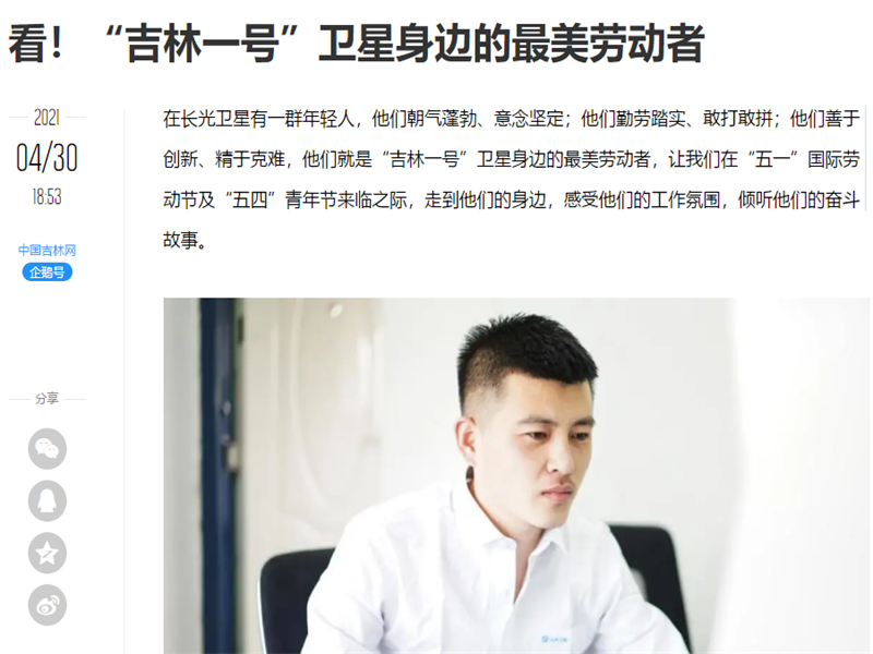 ● 腾讯网-看!“吉林一号”卫星身边的最美劳动者 在长光卫星有一群年轻人,他们朝气蓬勃、意念坚定;他们勤劳踏实、敢打敢拼;他们善于创新、精于克难,他们就是“吉林一号”卫星身边的最美劳动者,让我们在“五一”国际劳动节及“五四”青年节来临之际,走到他们的身边,感受他们的工作氛围,倾听他们的奋斗故事。 2021-04-30