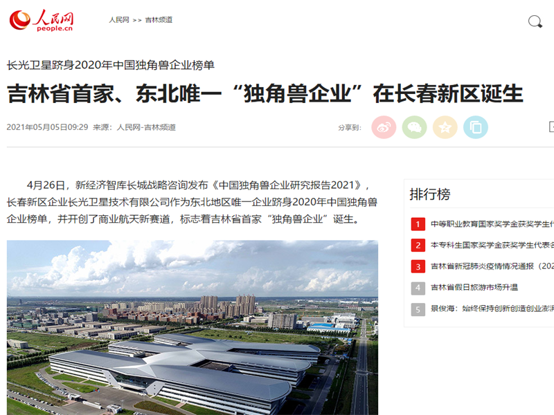 ● 人民网-吉林省首家、东北唯一“独角兽企业”在长春新区诞生 4月26日,新经济智库长城战略咨询发布《中国独角兽企业研究报告2021》,长春新区企业长光卫星技术有限公司作为东北地区唯一企业跻身2020年中国独角兽企业榜单,并开创了商业航天新赛道,标志着吉林省首家“独角兽企业”诞生。 2021-05-05