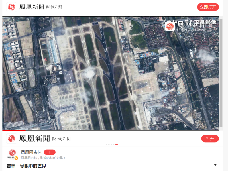 ● 凤凰新闻-吉林一号眼中的世界 4月24日,第六个“中国航天日”。“吉林一号”卫星从太空传回了中国上海、日本东京、西班牙巴伦西亚、阿联酋迪拜等地的卫星视频影像。影像中繁忙有序的机场、川流不息的车辆、鳞次栉比的建筑、急速行驶的火车等清晰可见。“吉林一号”邀大家一起欣赏卫星眼中的世界。 2021-04-25