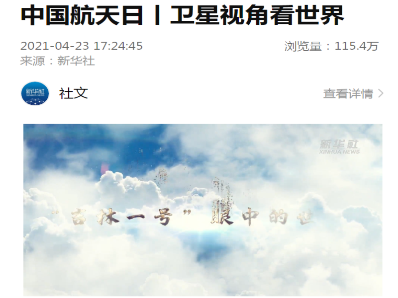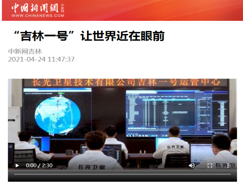 ● 中新网吉林-“吉林一号”让世界近在眼前 2021年4月24日,是第六个“中国航天日”。在航天日来临之际,“吉林一号”卫星介绍短片全新上线,在这里,距离不再局限你我,前进的方向不再迷茫。“吉林一号”让世界近在眼前。 2021-04-25