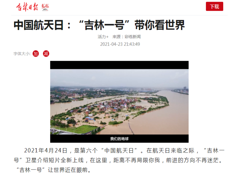 ● 吉林日报-中国航天日:“吉林一号”带你看世界 2021年4月24日,是第六个“中国航天日”。在航天日来临之际,“吉林一号”卫星介绍短片全新上线,在这里,距离不再局限你我,前进的方向不再迷茫。“吉林一号”让世界近在眼前。 2021-04-25