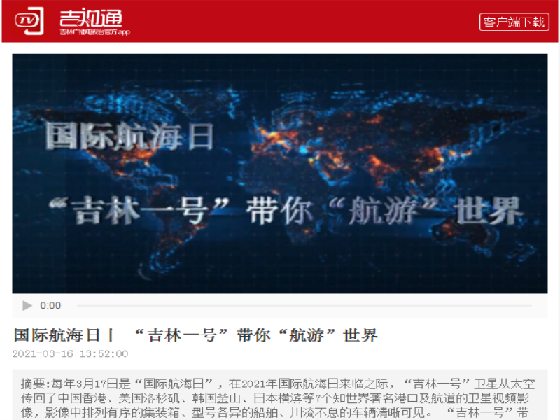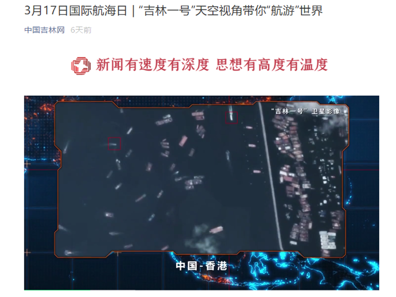 ● 中国吉林网-3月17日国际航海日 | “吉林一号”天空视角带你“航游”世界 每年的3月17日是“国际航海日”,在2021年国际航海日来临之际,“吉林一号”卫星从太空传回了中国香港、美国洛杉矶、韩国釜山、日本横滨等7个世界著名港口及航道的卫星视频影像,影像中排列有序的集装箱、型号各异的船舶、川流不息的车辆清晰可见。让我们跟随“吉林一号”的视角,一起“航游”世界,共赏盛景。 2021-03-17