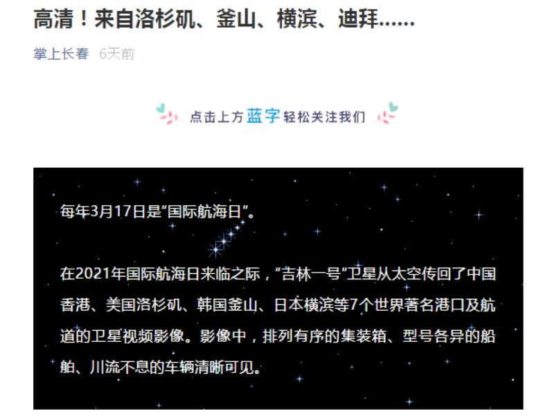 ● 掌上长春:高清!来自洛杉矶、釜山、横滨、迪拜...... 在2021年国际航海日来临之际,“吉林一号”卫星从太空传回了中国香港、美国洛杉矶、韩国釜山、日本横滨等7个世界著名港口及航道的卫星视频影像。影像中,排列有序的集装箱、型号各异的船舶、川流不息的车辆清晰可见。 2021-03-23