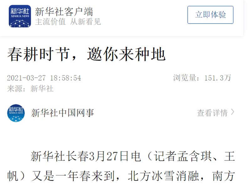 ● 新华社-春耕时节 邀你来种地 新华社长春3月27日电(记者孟含琪、王帆)又是一年春来到,北方冰雪消融,南方绿意渐浓。从东北黑土地到中原大地,一幅幅春耕、备耕图正在全国徐徐展开,让中国夯实粮食安全基础,端牢饭碗。种地也是一门学问,屏幕前的你懂种地吗?快来一探究竟吧! 2021-03-27