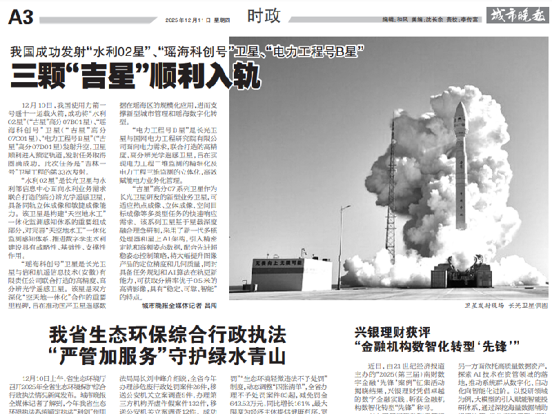 ● 城市晚报-三颗“吉星”顺利入轨 12月10日,我国使用力箭一号遥十一运载火箭,成功将“水利02星”(“吉星”高分07B01星)、“瑶海科创号”卫星(“吉星”高分07C01星)、“电力工程号B星”(“吉星”高分07D01星)发射升空,卫星顺利进入预定轨道,发射任务取得圆满成功。此次任务是“吉林一号”卫星工程的第33次发射。 2025-12-10