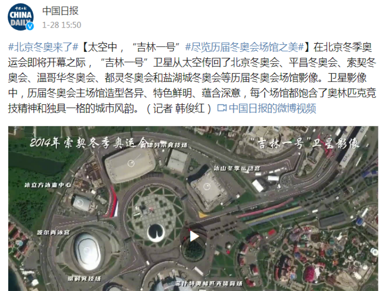 ● 中国日报-太空中,“吉林一号”#尽览历届冬奥会场馆之美 在北京冬季奥运会即将开幕之际,“吉林一号”卫星从太空传回了北京冬奥会、平昌冬奥会、索契冬奥会、温哥华冬奥会、都灵冬奥会和盐湖城冬奥会等历届冬奥会场馆影像。卫星影像中,历届冬奥会主场馆造型各异、特色鲜明、蕴含深意,每个场馆都饱含了奥林匹克竞技精神和独具一格的城市风韵。 2021-01-28