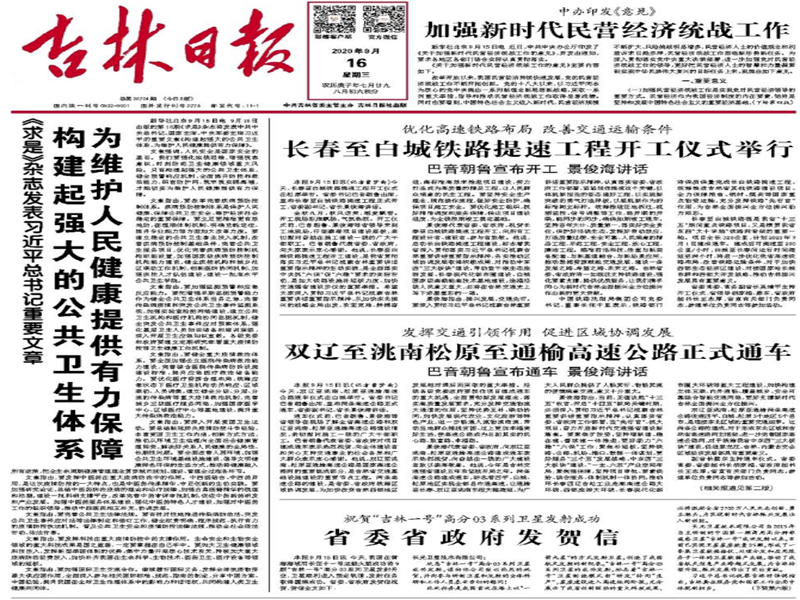 ● 吉林日报-祝贺“吉林一号”高分03系列卫星发射成功 本报9月15日讯 今天,我国在黄海海域用长征十一号运载火箭成功将9颗“吉林一号”高分03系列卫星发射升空,卫星顺利进入预定轨道,发射任务取得圆满成功。省委、省政府发贺信祝贺,贺信全文如下: 2020-09-16