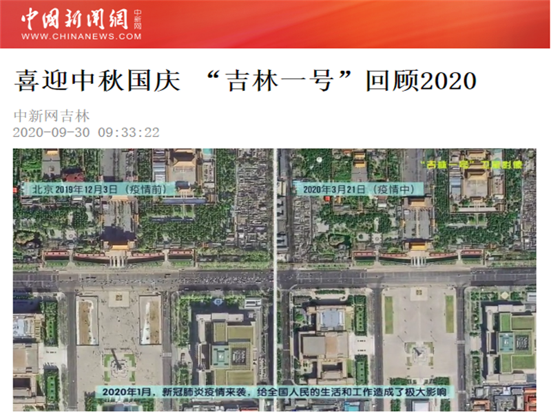 ● 中国新闻网-喜迎中秋国庆 “吉林一号”回顾2020 2020年,新型冠状病毒肺炎疫情来袭,四川、云南等地发生多起森林火灾,南方地区遭遇多轮强降雨……这一年灾难频发。但是困难和磨难阻挡不住中华民族伟大复兴的步伐,全国人民团结一心,共克艰难,打赢了一场场人民战争、总体战、阻击战。“吉林一号”卫星从太空记录了半年多以来祖国大地上发生的一幕又一幕,见证了中华... 2020-10-01