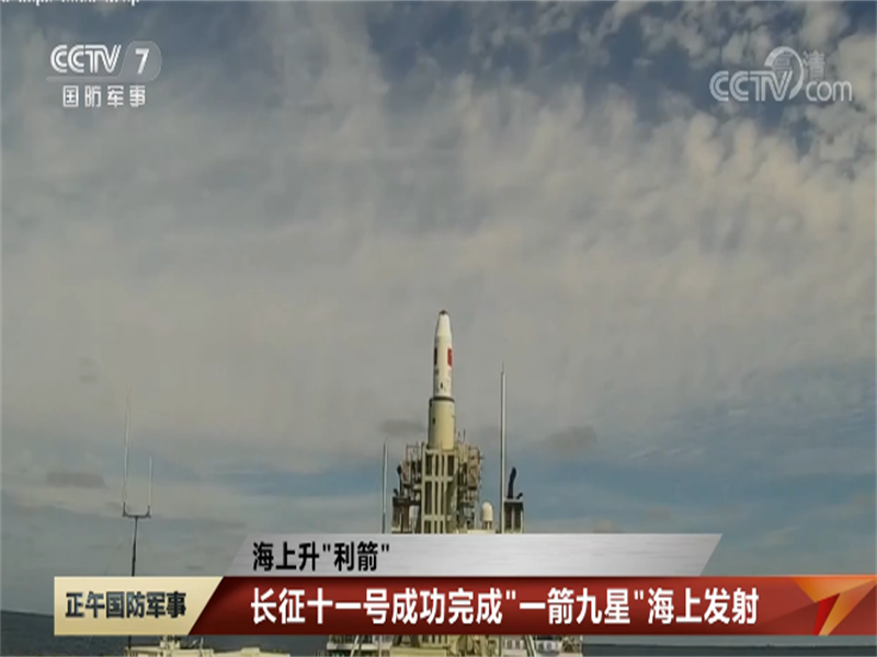 ● 正午国防军事-海上升“利箭” 长征十一号成功完成“一箭九星”海上发射 2020年9月15日,我国在黄海海域用长征十一号海射运载火箭,采取“一箭九星”方式将“吉林一号”高分03-1组卫星送入预定轨道,发射获得圆满成功。 2020-09-15