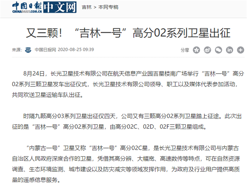 ● 长春日报-“吉林一号”:5天12颗卫星出征 24日一早,“吉林一号”又有3颗卫星出征。此次出征的是“吉林一号”高分02系列卫星,由高分02C、02D、02F等3颗卫星组成。其中,高分02C星是长光卫星与内蒙古自治区人民政府深度合作的卫星,凭借其高分辨、大幅宽、高速数传等特点,可在自然资源调查、生态环境监测、城市建设以及防灾减灾等领域发挥作用,... 2020-08-25