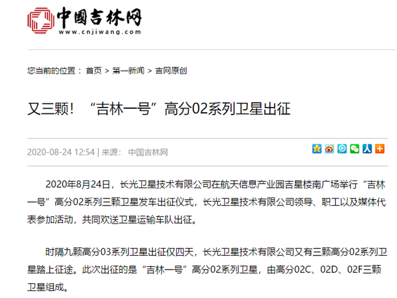 ● 中国吉林网-又三颗!“吉林一号”高分02系列卫星出征 2020年8月24日,长光卫星技术有限公司在航天信息产业园吉星楼南广场举行“吉林一号”高分02系列三颗卫星发车出征仪式,长光卫星技术有限公司领导、职工以及媒体代表参加活动,共同欢送卫星运输车队出征。 2020-08-24