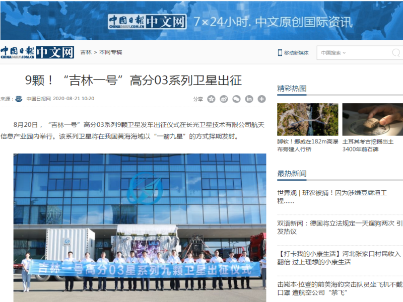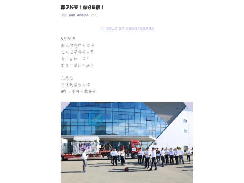 ● 出征!“吉林群星”剑指苍穹 8月20日清晨,长光卫星技术有限公司航天信息产业园。一辆重卡徐徐地从厂房开至吉星楼前,科研人员们簇拥着这辆搭载着“吉林一号”高分03系列9颗卫星的车辆,共同欢送新星出征,问鼎苍穹。 2020-08-21