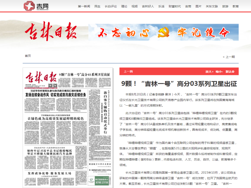 ● 9颗!“吉林一号”高分03系列卫星出征 本报8月20日讯(记者李晓静 景洋)今天,“吉林一号”高分03系列9颗卫星发车出征仪式在长光卫星技术有限公司航天信息产业园内举行。该系列卫星将在我国黄海海域以“一箭九星”的方式择期发射。 2020-08-21