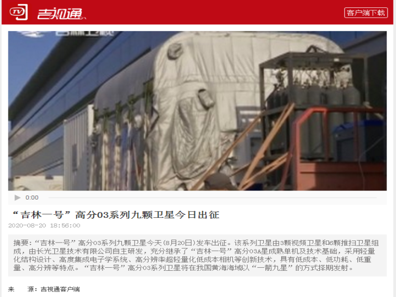 ● 9颗!“吉林一号”高分03系列卫星出征 8月20日,“吉林一号”高分03系列9颗卫星发车出征仪式在长光卫星技术有限公司航天信息产业园内举行。该系列卫星将在我国黄海海域以“一箭九星”的方式择期发射。 2020-08-21