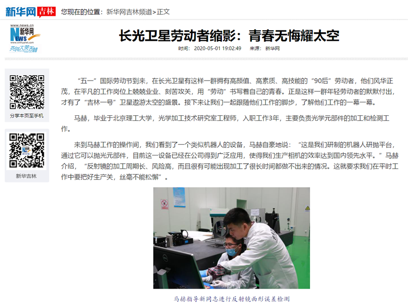 ● 新华网-长光卫星劳动者缩影:青春无悔耀太空 “五一”国际劳动节到来,在长光卫星有这样一群拥有高颜值、高素质、高技能的“90后”劳动者,他们风华正茂,在平凡的工作岗位上兢兢业业、刻苦攻关,用“劳动”书写着自己的青春。正是这样一群年轻劳动者的默默付出,才有了“吉林一号”卫星遨游太空的盛景。接下来让我们一起跟随他们工作的脚步,了解他们工作的一幕一幕... 2020-05-01
