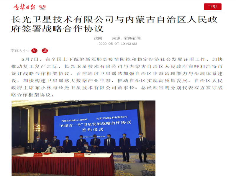 ● 彩练新闻-长光卫星技术有限公司与内蒙古自治区人民政府签署战略合作协议 5月7日,在全国上下统筹新冠肺炎疫情防控和稳定经济社会发展各项工作、加快推动复工复产之际,长光卫星技术有限公司与内蒙古自治区人民政府在呼和浩特市签订战略合作框架协议,旨在通过卫星遥感加强自治区生态治理能力与治理体系建设,加快构建卫星遥感大数据产业生态,推动自治区实现高质量发展。自治区人民政府主席布小... 2020-05-07