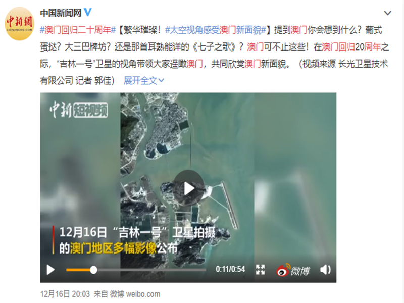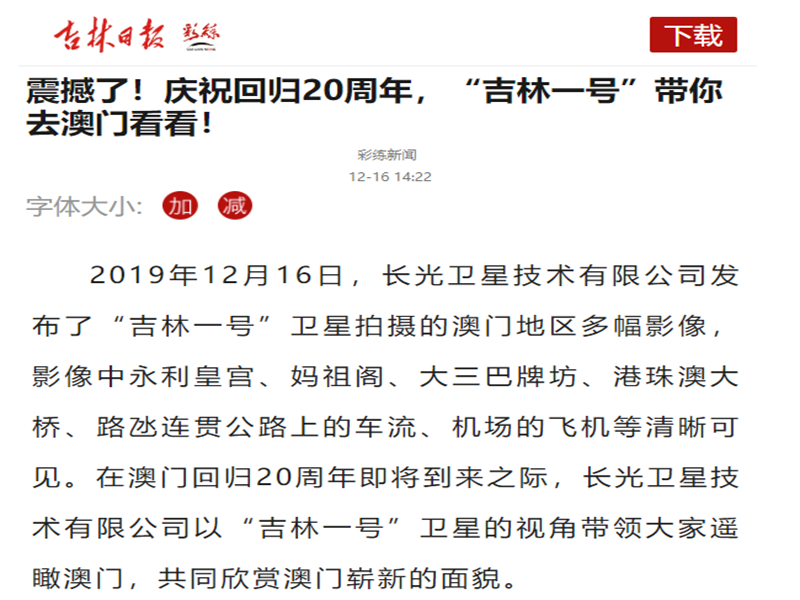 ● 吉林日报-震撼了!庆祝回归20周年,“吉林一号”带你去澳门看看! 2019年12月16日,长光卫星技术有限公司发布了“吉林一号”卫星拍摄的澳门地区多幅影像,影像中永利皇宫、妈祖阁、大三巴牌坊、港珠澳大桥、路氹连贯公路上的车流、机场的飞机等清晰可见。在澳门回归20周年即将到来之际,长光卫星技术有限公司以“吉林一号”卫星的视角带领大家遥瞰澳门,共同欣赏澳门崭新的面貌。 2019-12-16