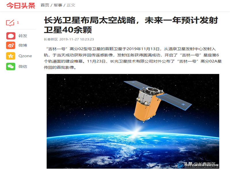 ● 人民网-走近航天信息产业 探秘宇宙卫星 2019年11月13日,由长光卫星技术有限公司自主研发的新型光学遥感卫星“吉林一号”高分02A星在中国酒泉卫星发射中心成功发射。“截止到目前,“吉林一号”卫星数量增至14颗,11月再发射一颗卫星,春节后还会继续发射3颗” 长光卫星技术有限公司副总经理贾宏光谈起卫星发射时说道。 2019-11-27