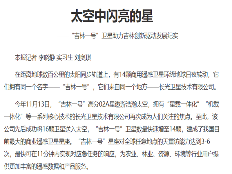 ● 吉林日报-太空中闪亮的星 在距离地球数百公里的太阳同步轨道上,有14颗商用遥感卫星环绕地球日夜转动,它们拥有同一个名字——“吉林一号”,它们来自同一个地方——长光卫星技术有限公司。 2019-11-30