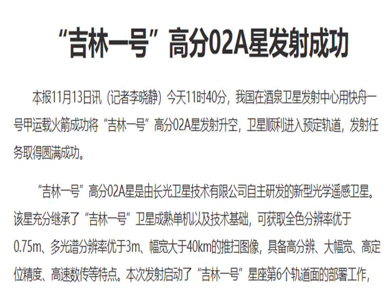 ● 吉林日报-“吉林一号”高分02A星发射成功 本报11月13日讯(记者李晓静)今天11时40分,我国在酒泉卫星发射中心用快舟一号甲运载火箭成功将“吉林一号”高分02A星发射升空,卫星顺利进入预定轨道,发射任务取得圆满成功。 2019-11-14