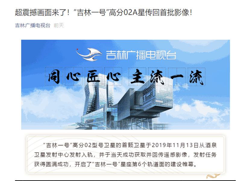 ● 吉林广播电视台-超震撼画面来了!“吉林一号”高分02A星传回首批影像! “吉林一号”高分02型号卫星的首颗卫星于2019年11月13日从酒泉卫星发射中心发射入轨,并于当天成功获取并回传遥感影像,发射任务获得圆满成功,开启了“吉林一号”星座第6个轨道面的建设帷幕。 2019-11-23