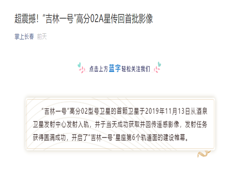 ● 掌上长春-超震撼!“吉林一号”高分02A星传回首批影像 “吉林一号”高分02型号卫星的首颗卫星于2019年11月13日从酒泉卫星发射中心发射入轨,并于当天成功获取并回传遥感影像,发射任务获得圆满成功,开启了“吉林一号”星座第6个轨道面的建设帷幕。 2019-11-23