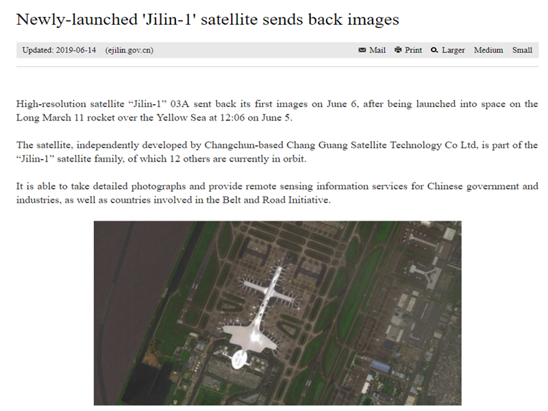● Newly-launched 'Jilin-1' satellite sends back images High-resolution satellite “Jilin-1” 03A sent back its first images on June 6, after being launched into space on the Long March 11 rocket over the Yel... 2019-06-14