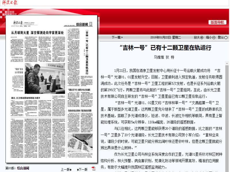 ● 【凤凰卫视】-“吉林一号”再添两卫星 组网达十二颗 2019年1月21日,由长光卫星自主研发的“吉林一号”光谱01/02星又被称为“吉林林草一号”、“文昌超算一号”卫星发射升空。 2019-01-22