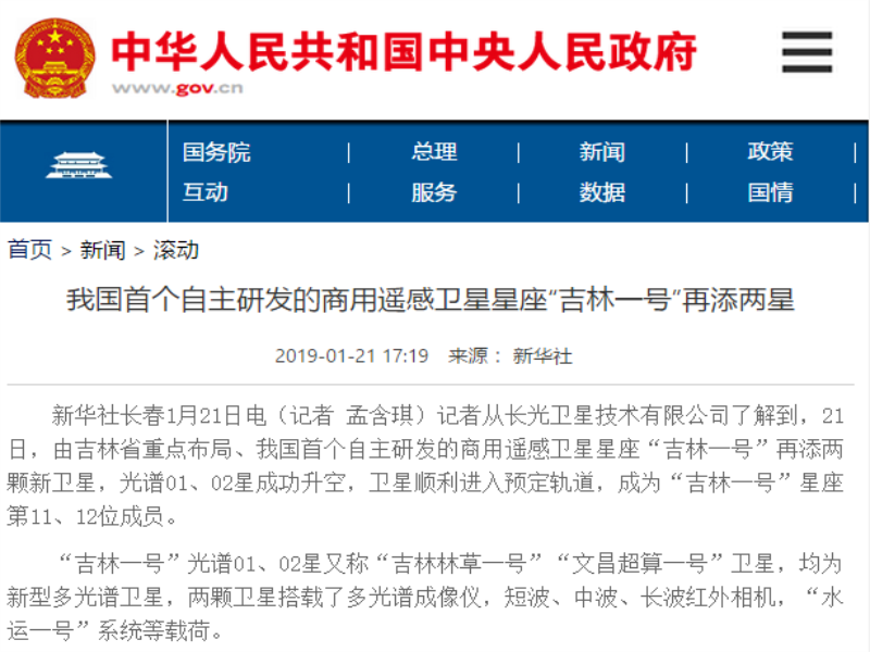 ● 【中华人民共和国中央人民政府】- 我国首个自主研发的商用遥感卫星星座“吉林一号”再添两星 新华社长春1月21日电(记者 孟含琪)记者从长光卫星技术有限公司了解到,21日,由吉林省重点布局、我国首个自主研发的商用遥感卫星星座“吉林一号”再添两颗新卫星,光谱01、02星成功升空,卫星顺利进入预定轨道,成为“吉林一号”星座第11、12位成员。 2019-01-22