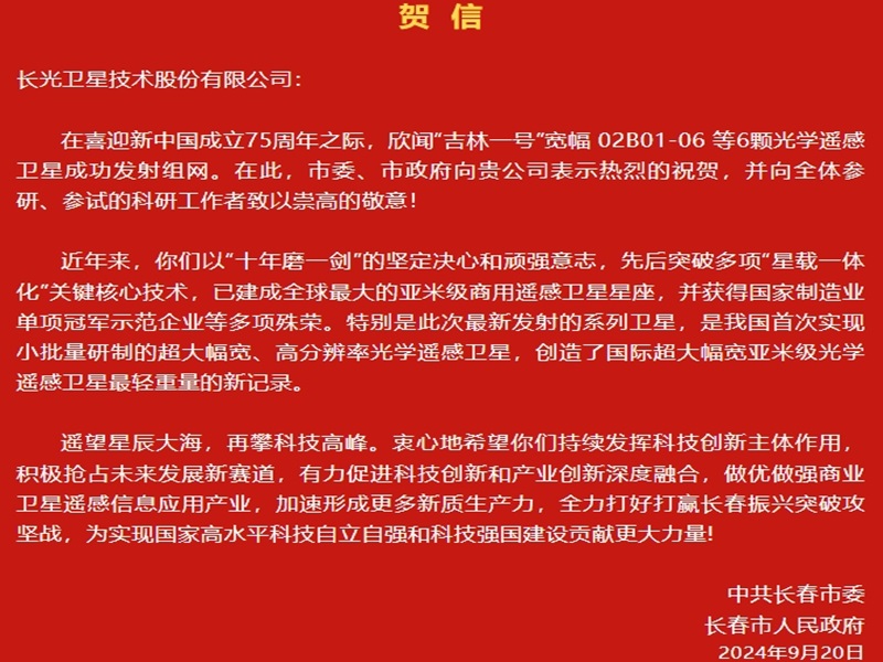 ● 掌上长春-贺信 在喜迎新中国成立 75 周年之际,欣闻“吉林一号”宽幅 02B01-06 等 6 颗光学遥感卫星成功发射组网。在此,市委、市政府向贵公司表示热烈的祝贺,并向全体参研、参试的科研工作者致以崇高的敬意! 2024-09-20