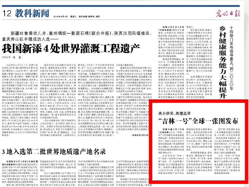 ● 光明日报-“吉林一号”全球一张图发布 近日,“吉林一号”卫星拍摄的高清遥感地图即全球一张图在吉林长春发布。该图可为各行业用户提供全球高清卫星遥感数据及应用服务,其分辨率、时效性及定位精度等指标均达到国际领先水平。 2024-09-04