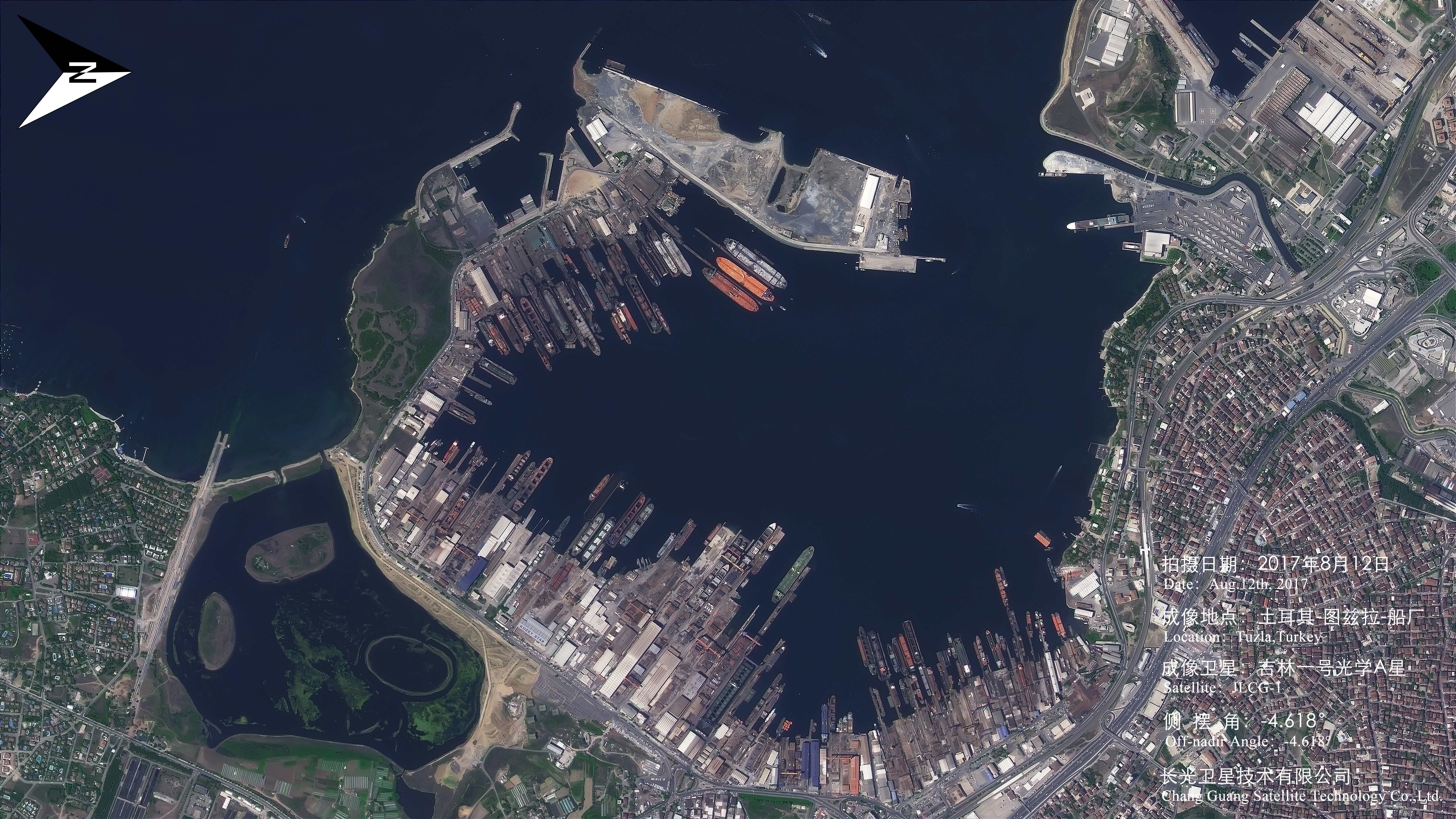 图兹拉港口依靠在马尔马拉海,从卫星影像看,整个港口呈月牙形状。这里主要负责港口拖船、引航和海上服务,是世界上知名的船舶建造和维修中心之一。