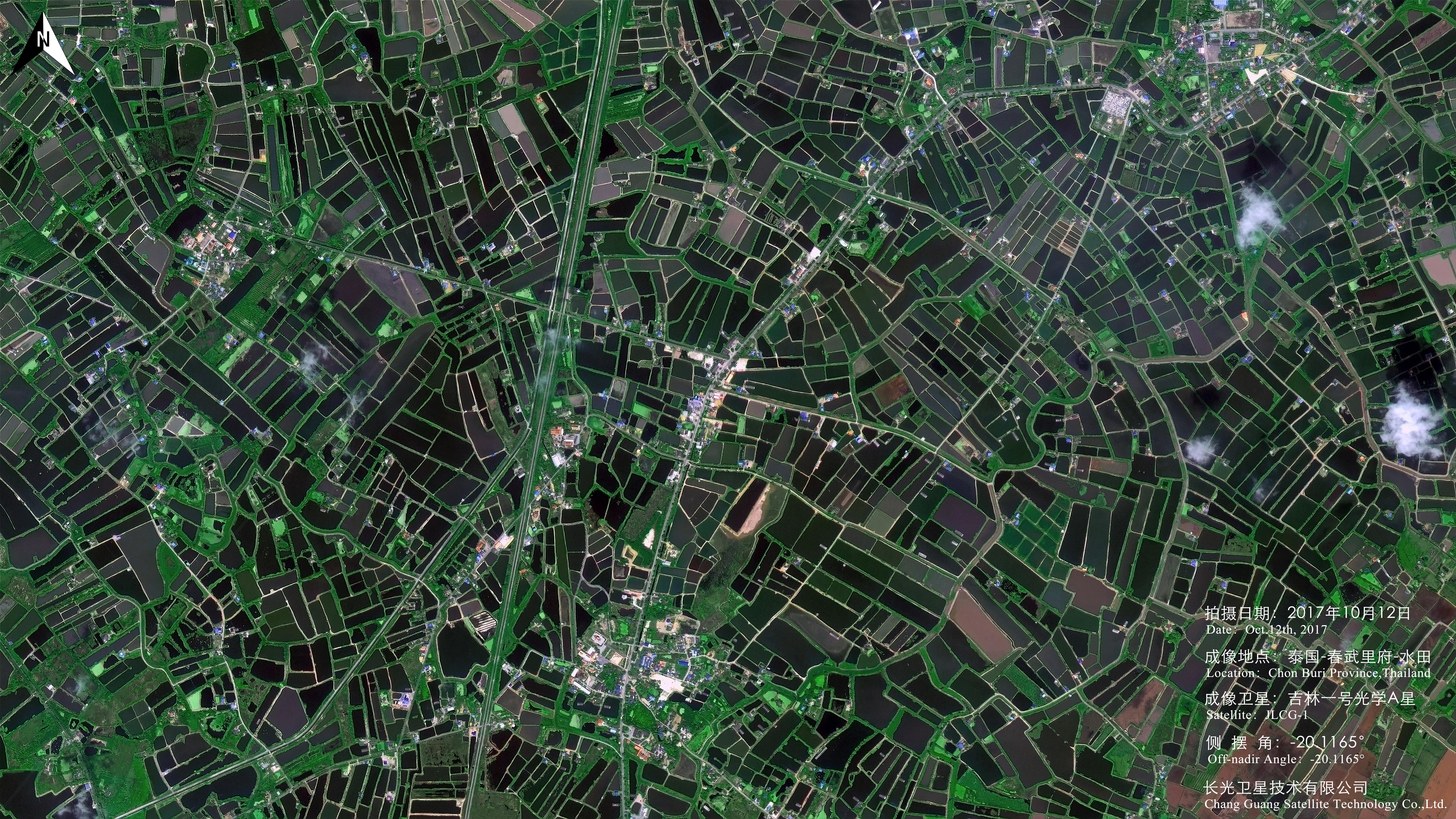 春武里府位于泰国东部,在印度梵文中有“水都”之意。春武里府土地面积为4,363平方公里,自然资源丰富,西南面为泰国湾,使其拥有优美的海滩和纯净的空气。卫星影像所拍摄的区域位于春武里府北部,该处属于平川,适于农业耕作,被大片水田所包围。