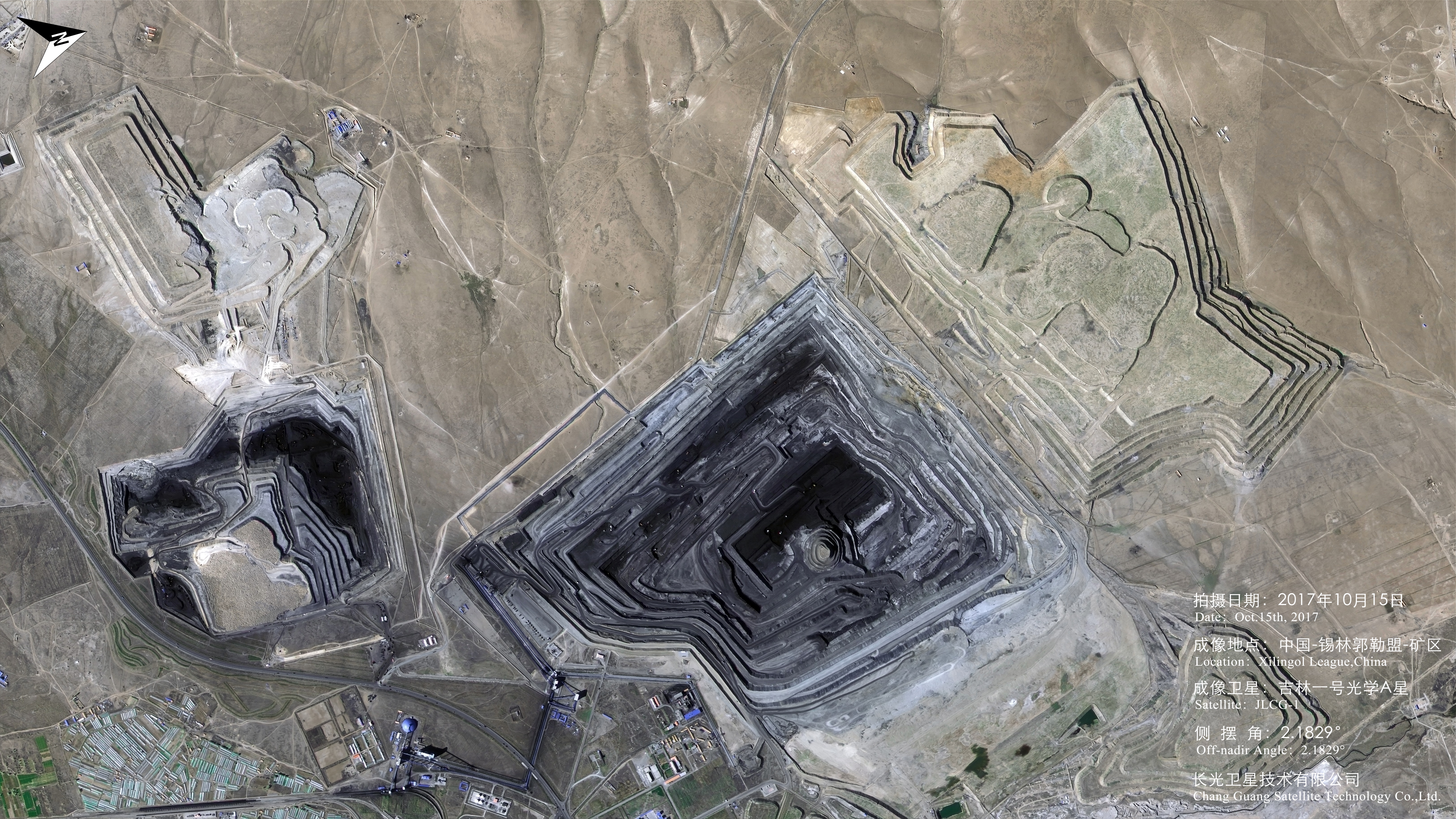 锡林郭勒盟是内蒙古自治区所辖盟,位于中国正北方,是距京、津、唐最近的草原牧区,既是国家重要的畜产品基地,又是西部大开发的前沿。卫星图为锡林郭勒盟西北方向的一处露天矿,矿内的道路、矿车清晰可见,道路螺旋向下,仿佛深不见底的黑色漩涡,让人炫目。矿区周围有多条省道,为矿产的运输提供了便利条件。